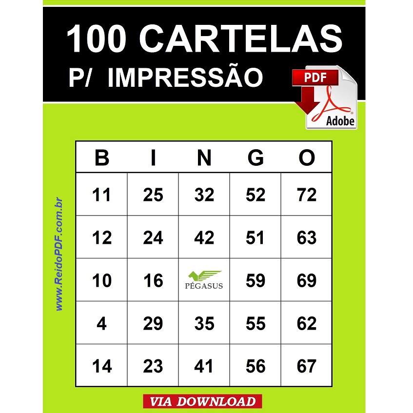 Ao todo são 100 cartelas prontas para impressão (1 por página) e sem repetições. Por serem cartelas com tamanhos grandes, são ideais para jogos de bingos com pessoas da terceira idade ou mesmo com número reduzido de participantes.